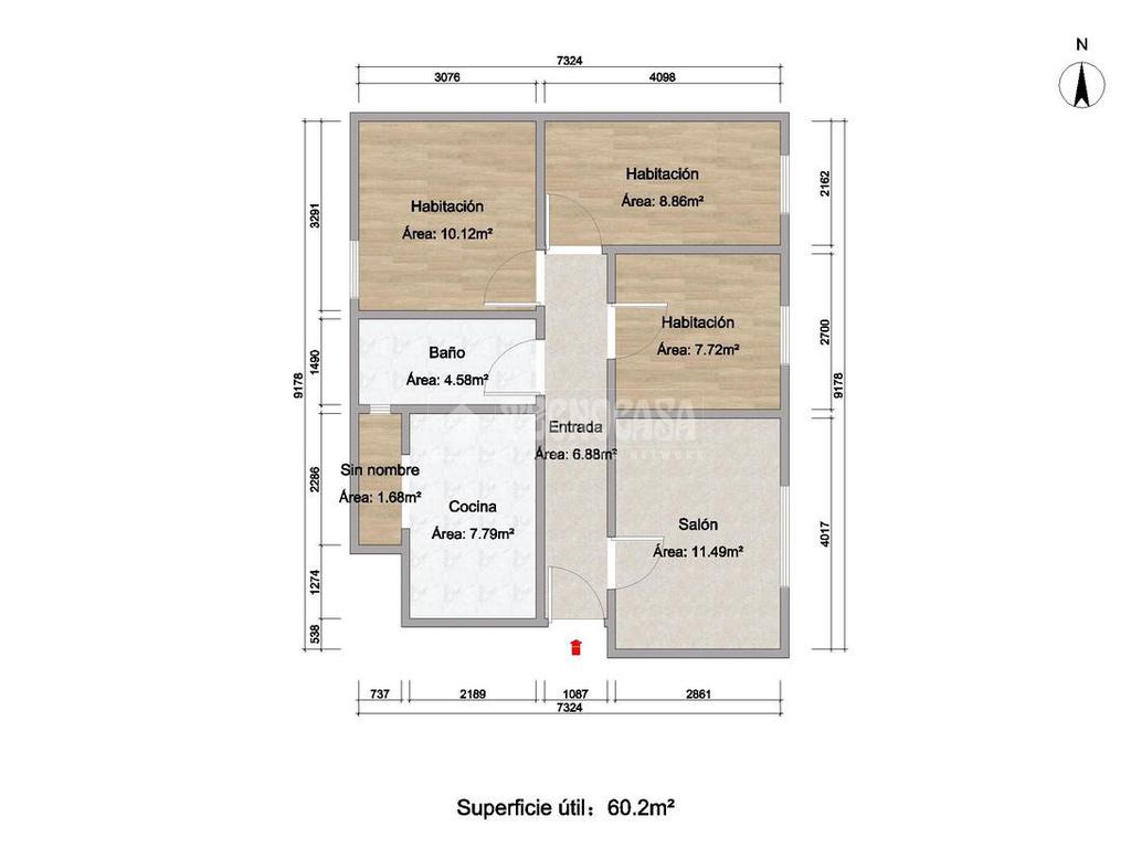 Hall de entrada, amplio salón-comedor muy luminoso, cocina, tres dormitorios y cuarto de baño exterior.