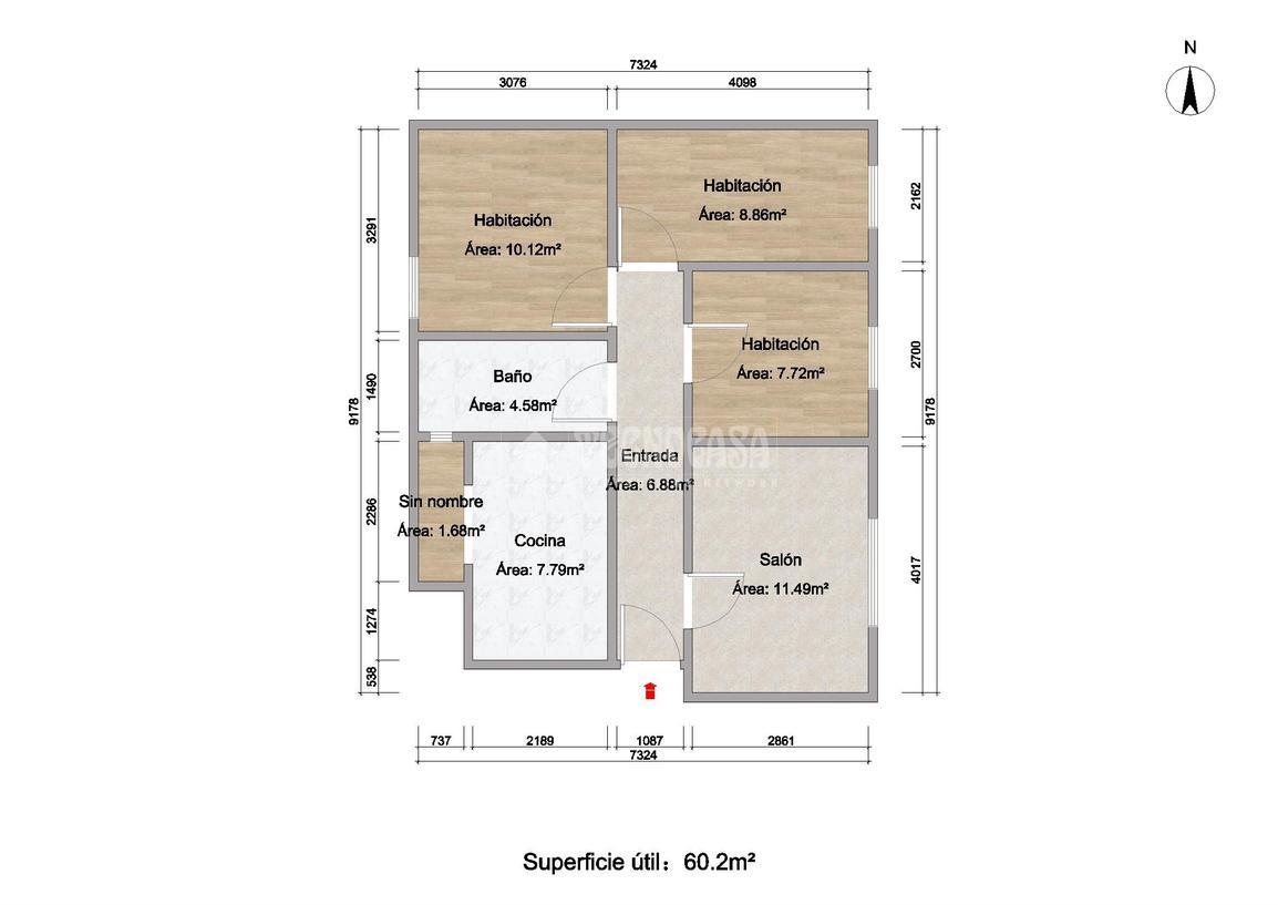 Suelo vinílico imitación tarima , gres en la cocina y baño, calefacción individual de gas natural.